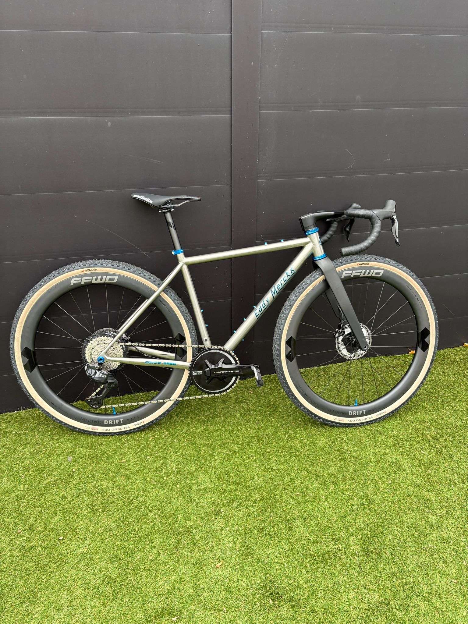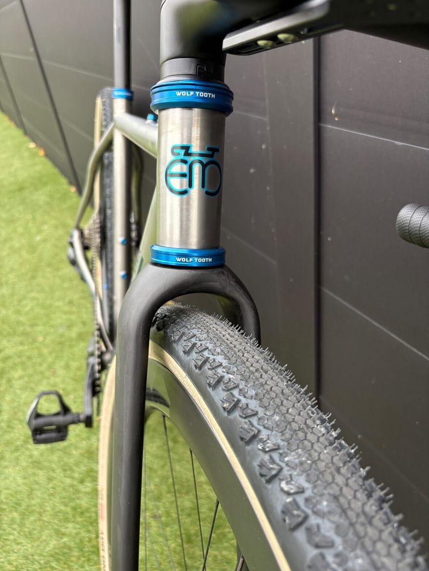This titanium prototype has a tyre clearance of 47 millimetres. It also has a UDH and internal cabling. Furthermore, this prototype was built with a Shimano Deore XT rear derailleur and cassette, a Wolftooth 50T chainring, Wolftooth small parts, FFWD Drift wheels and Vittoria Tirreno Dry tyres.
