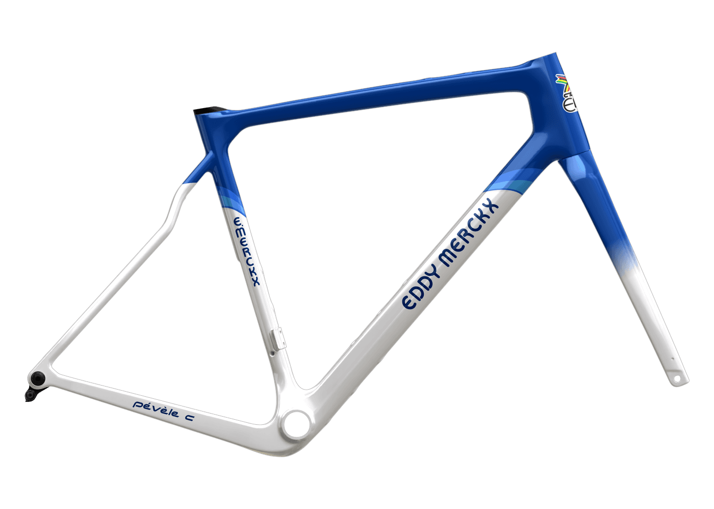 The distinctive curved seat tubes of Eddy Merckx improve comfort and compliance while ensuring optimal power transfer and stiffness. This seat tube design is characteristic of the carbon Eddy Merckx bikes, contributing to the unique look and feel.